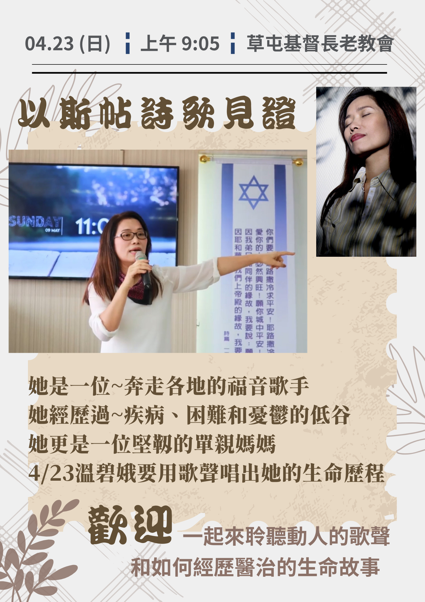 「我要一生向上主唱詩!我還活的時候,要向我上帝歌頌!」(詩篇104:33)4/23(福音主日)禮拜中邀請「福音歌手溫碧娥(以斯帖)-詩歌見證」,邀請您也歡迎您揪親朋好友一同前來聆聽,透過福音歌手溫碧娥(以斯帖)-詩歌見證生命的分享,讓更多人能認識神、親近神。 ▌日期:2023年4月23日 (星期日) ▌時間:上午9:05 ▌地點:草屯長老教會