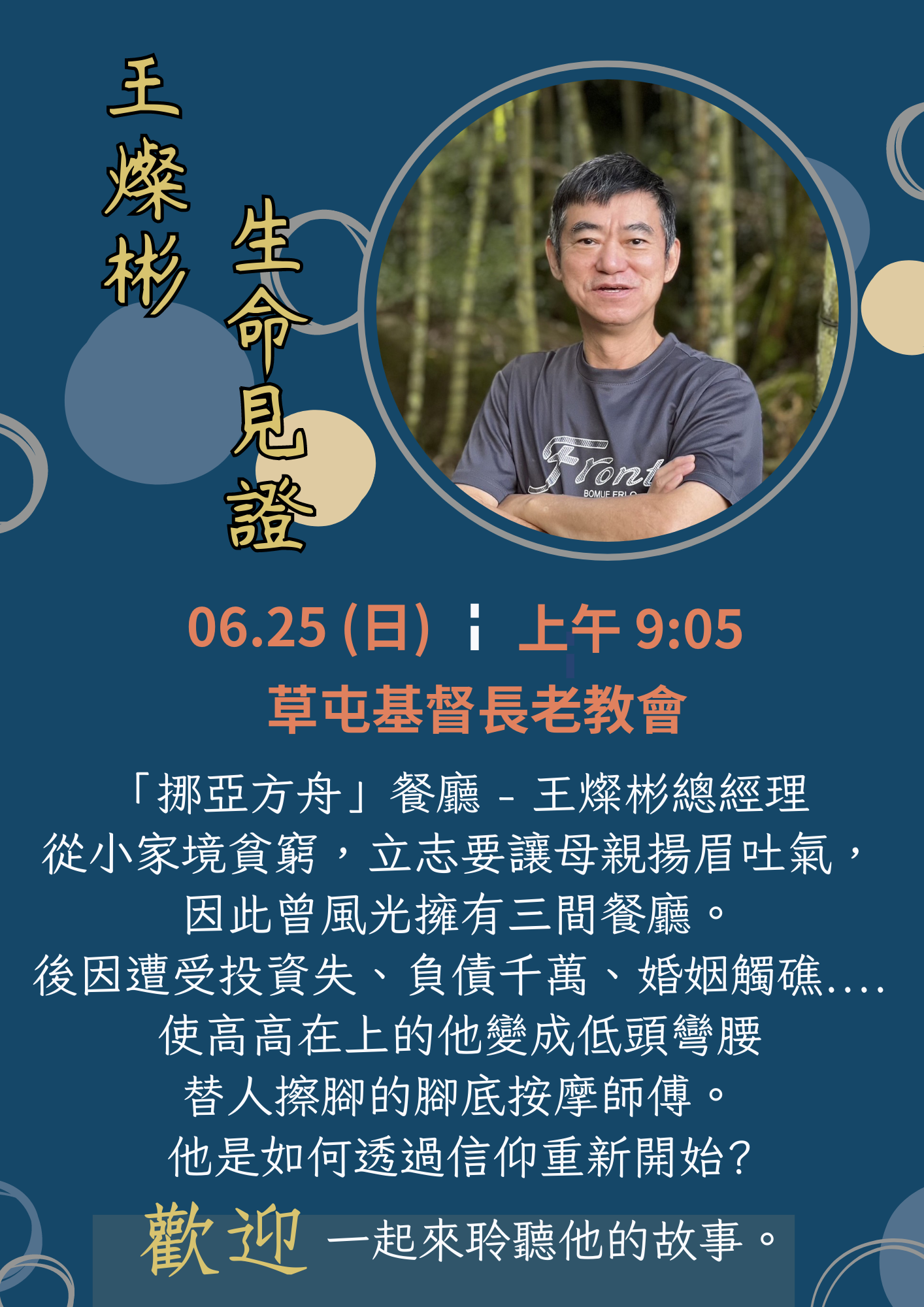「賞賜的是耶和華、收取的也是耶和華。」(約伯記1:21下)6/25(福音主日)禮拜中邀請「王燦彬生命見證」,王燦彬長老:「我願意用有生之年,成為神使用的器皿...」邀請您也歡迎您揪親朋好友一同前來聆聽,透過王燦彬長老生命見證的分享,讓更多人能認識神、親近神。 ▌日期:2023年6月25日 (星期日) ▌時間:上午9:05 ▌地點:草屯長老教會