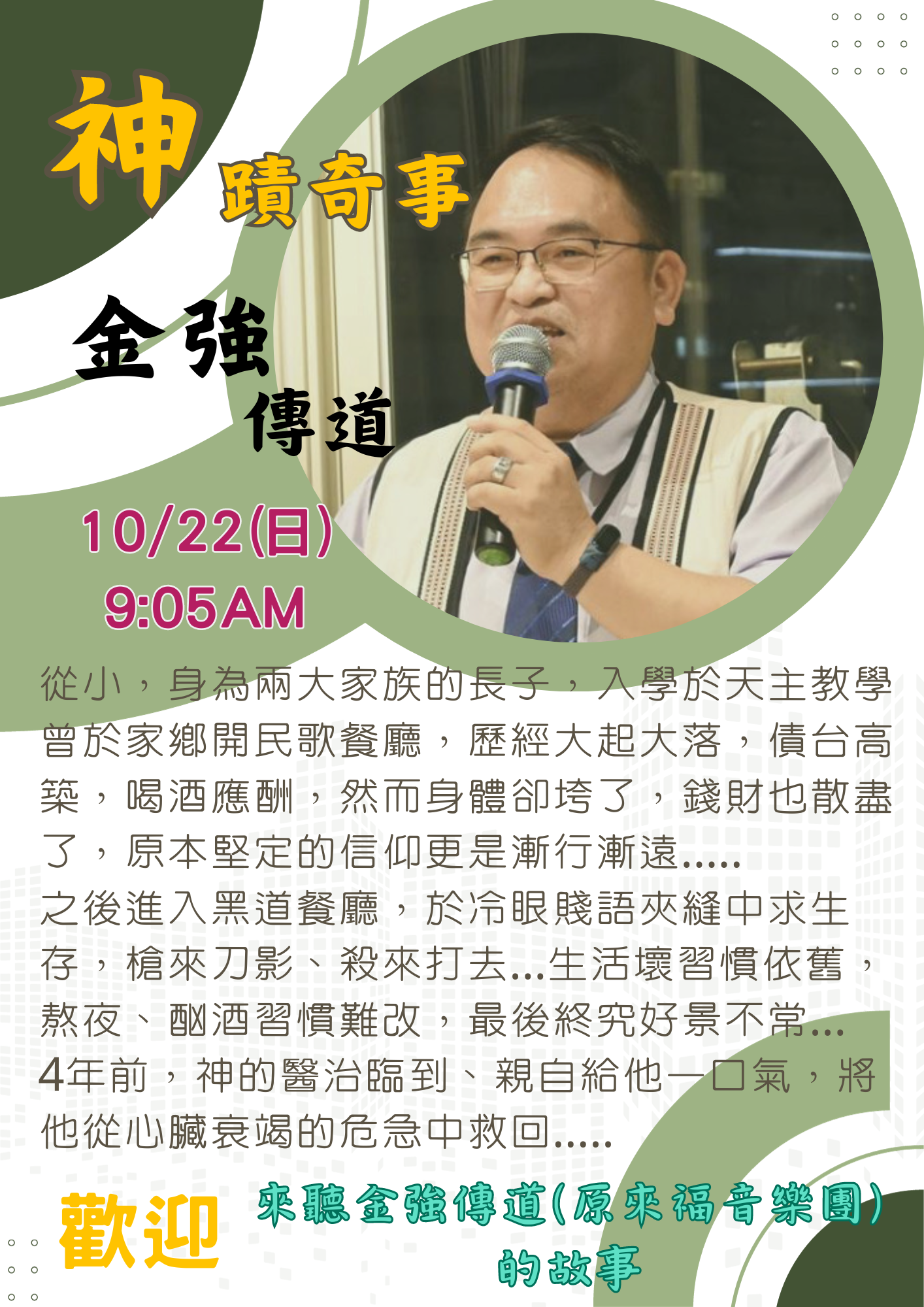 10/22(福音主日)禮拜中邀請「金強生命見證-神蹟奇事」,