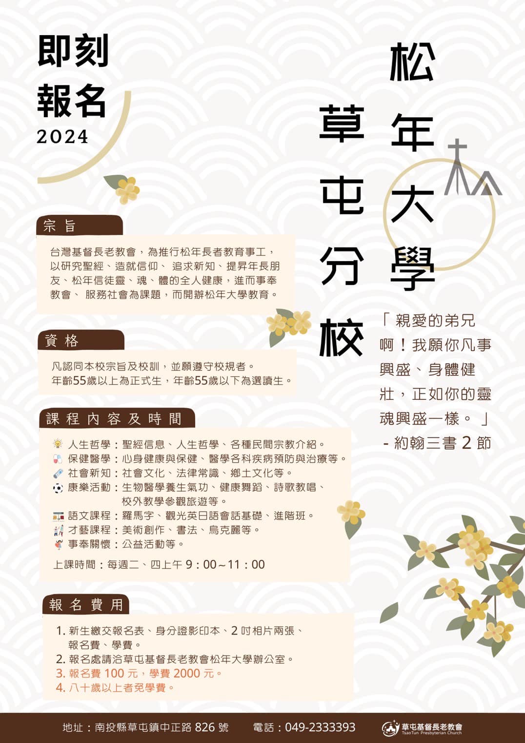 草屯長老教會辦理松年大學已逾十多年,壯年、松年皆在愉快氛圍中學習新知、結交朋友!