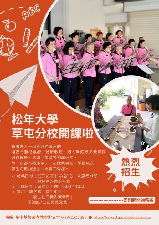 草屯長老教會辦理松年大學已逾十多年,壯年、松年皆在愉快氛圍中學習新知、結交朋友!
