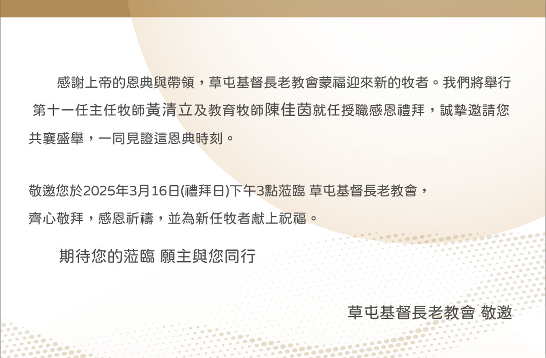 草屯教會第十一任主任牧師黃清立暨教育牧師陳佳茵就任授職感恩禮拜
