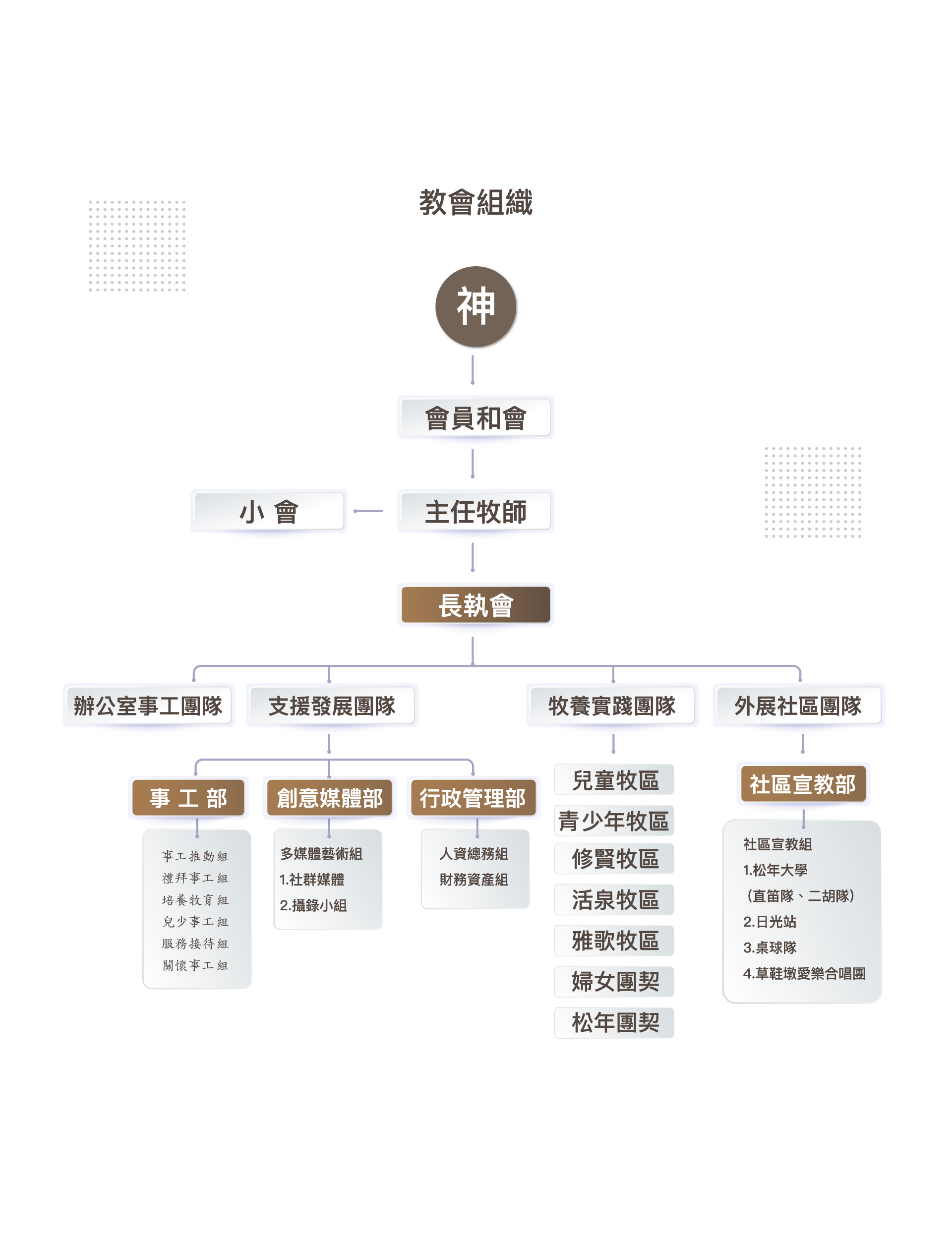 由牧師、長老及執事組成,每月定期召開會議,邀請牧區長及團契會長列席,共同討論及執行福音事工;團隊也秉持信仰傳承的美德,分享成功經驗予年輕一輩的長執,接受來自新世代的改變,打造活水湧流的氛圍。
